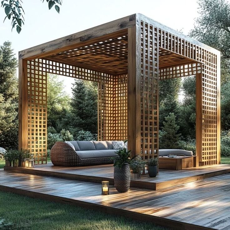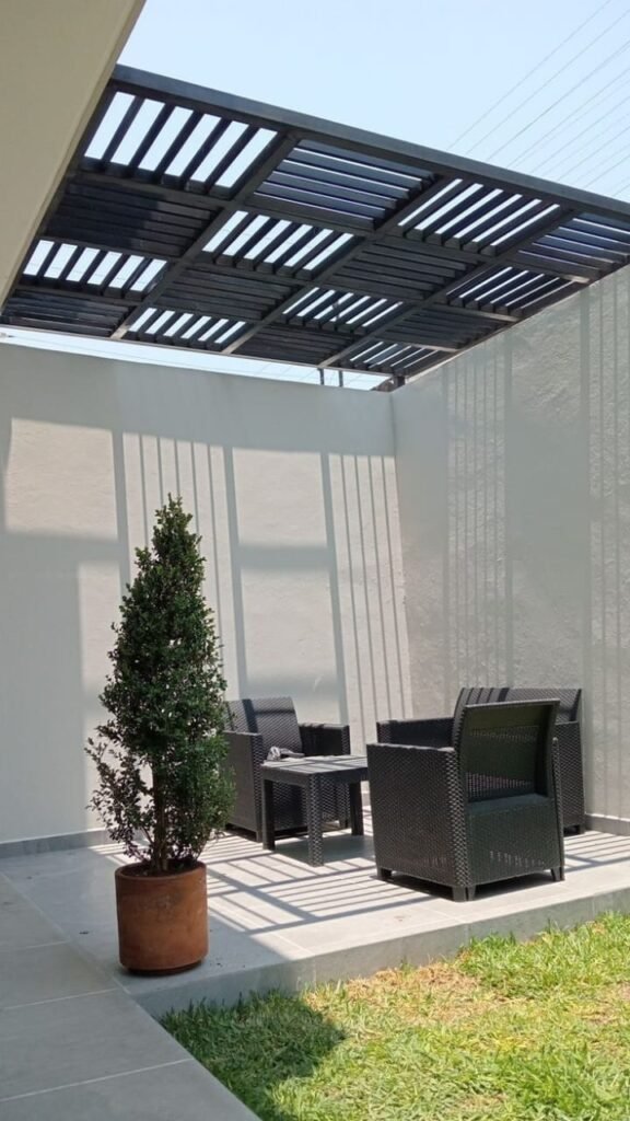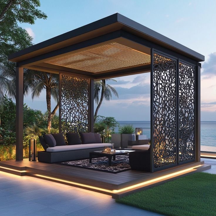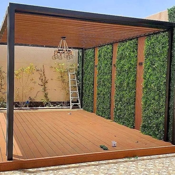 دمج النباتات المعلّقة حول هيكل البرجولة أو إضافة أسوار خشبية جانبية يخلق توازناً بين الطبيعة والتصميم العصري.