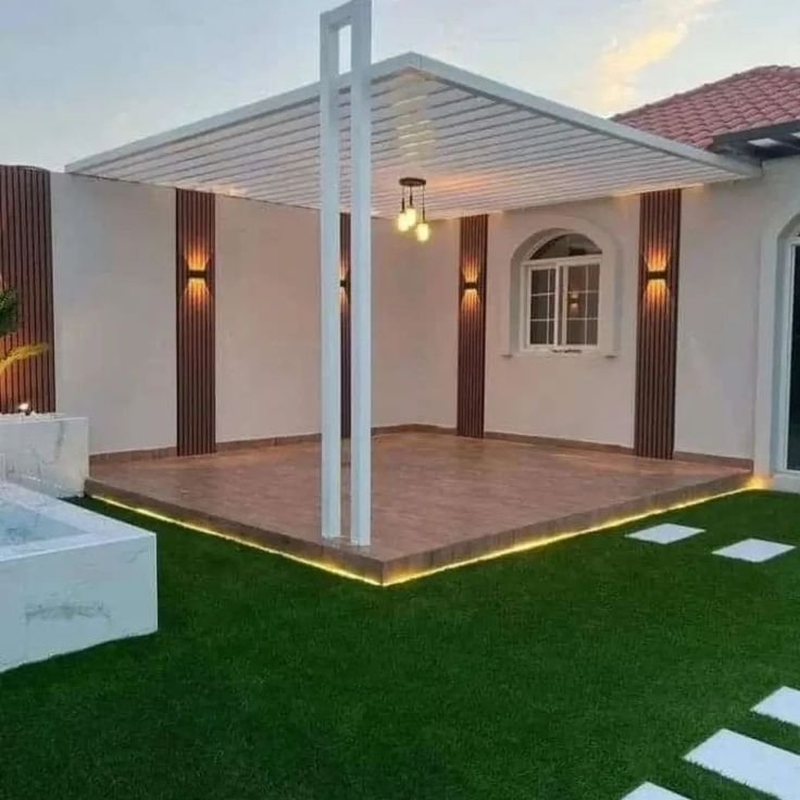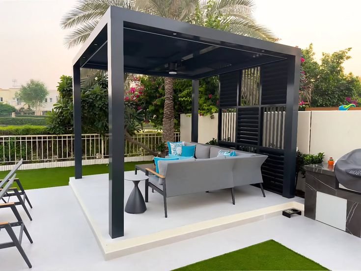 - إضافة الغطاء أو السقف: يتم اختيار نوع السقف بحسب التصميم سواء كان قماشاً مشدوداً، ألواحاً معدنية، خشباً مفتوحاً أو نظاماً زجاجياً معزولاً.