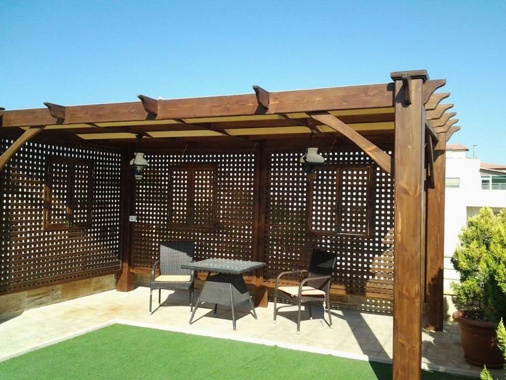 يُستخدم الخشب بكثرة في تصميم البرجولات لما يضفيه من دفء وجمال طبيعي، بشرط أن يكون معالَجاً ضد الرطوبة والحشرات ومغطى بطبقة حماية من الأشعة الشمسية.